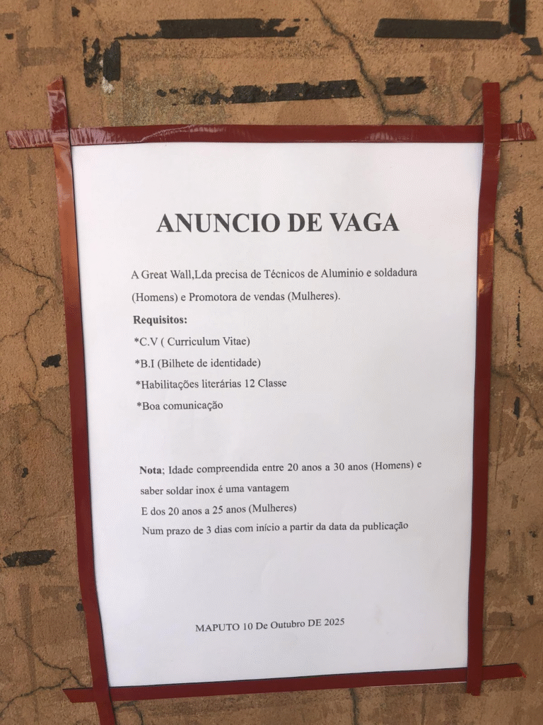 A Great Wall, Lda precisa de Técnicos de Alumínio e soldadura (Homens) e Promotora de vendas (Mulheres).